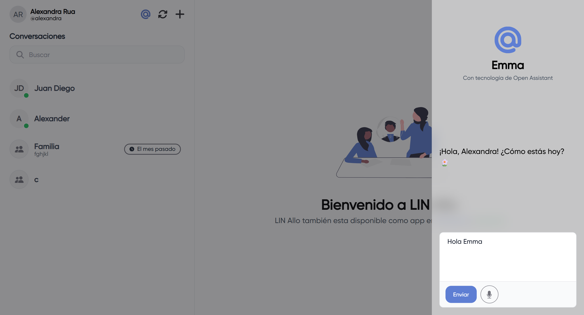 Con Emma, tu asistente inteligente integrada en LIN Allo, comunicarte y organizarte nunca fue tan fácil. Emma entiende tus necesidades y te ayuda a automatizar tareas cotidianas dentro de la aplicación: puedes pedirle que envíe mensajes, cree o recuerde eventos en tu calendario.